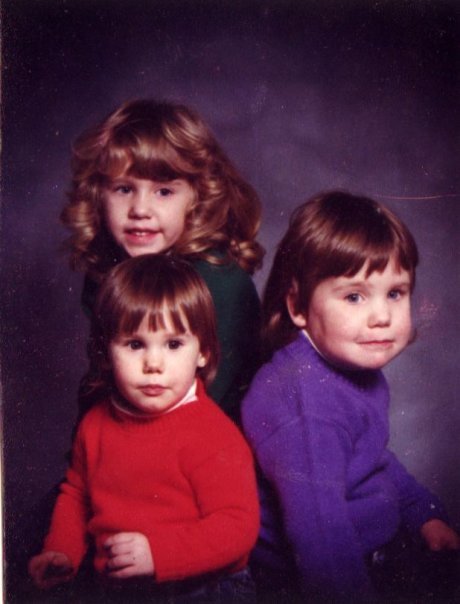 I am having a hard time really believing that my sister, my roommate of 14 years, my best playmate, and fashion consultant, is getting married. I still remember us like this(Abbe's in green, Maggie-the bride- is in Purple, and I-the baby- am in red):